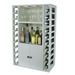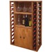 Botellero fabricado con listones de pino tratado, tapa y base de tablero de pino alistonado, trasera de tablero de pino laminado, teñido en color roble y una mano de barniz para fijar el tinte. Incorpora dos puertas, un soporte para copas y balda para botellas de licor.