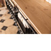 Su tapa es de madera maciza de roble, procedente directamente de un gran bloque, de carpintería de primerísima calidad, con el menor número de “nudos” posibles, trabajada sobre largos listones, a lo largo de toda la tapa. Su espesor también es extraordinario (45 mm frente a 38 mm de una encimera estándar) y hace que la encimera sea extremadamente robusta, como todos los estantes y revestimientos metálicos. palas, a lo largo de toda la tabla.